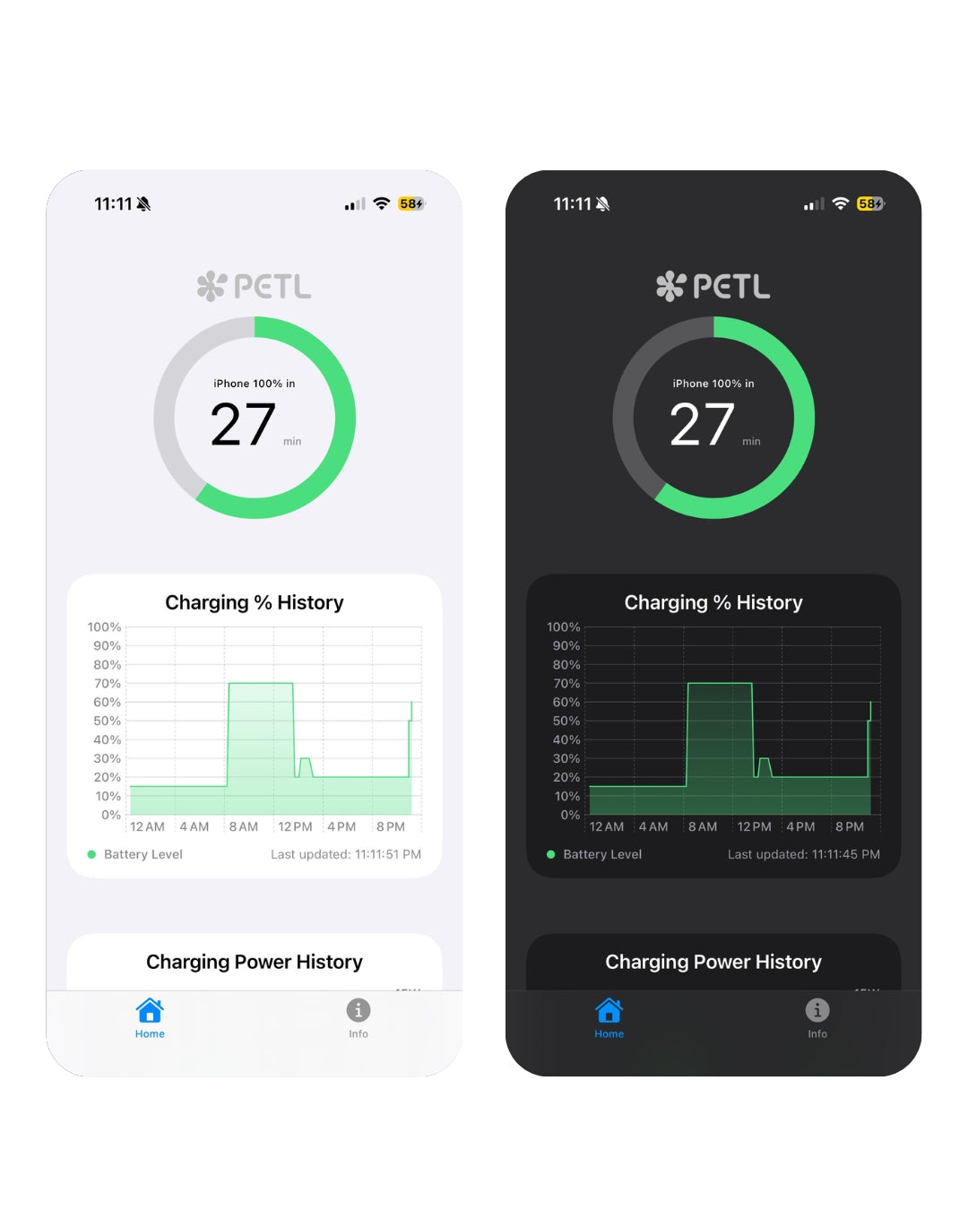goPETL adapts automatically to your iPhone’s appearance — whether you prefer Light or Dark Mode. Every detail, from battery rings to data graphs, adjusts in real time for a seamless look that feels right at home on iOS.