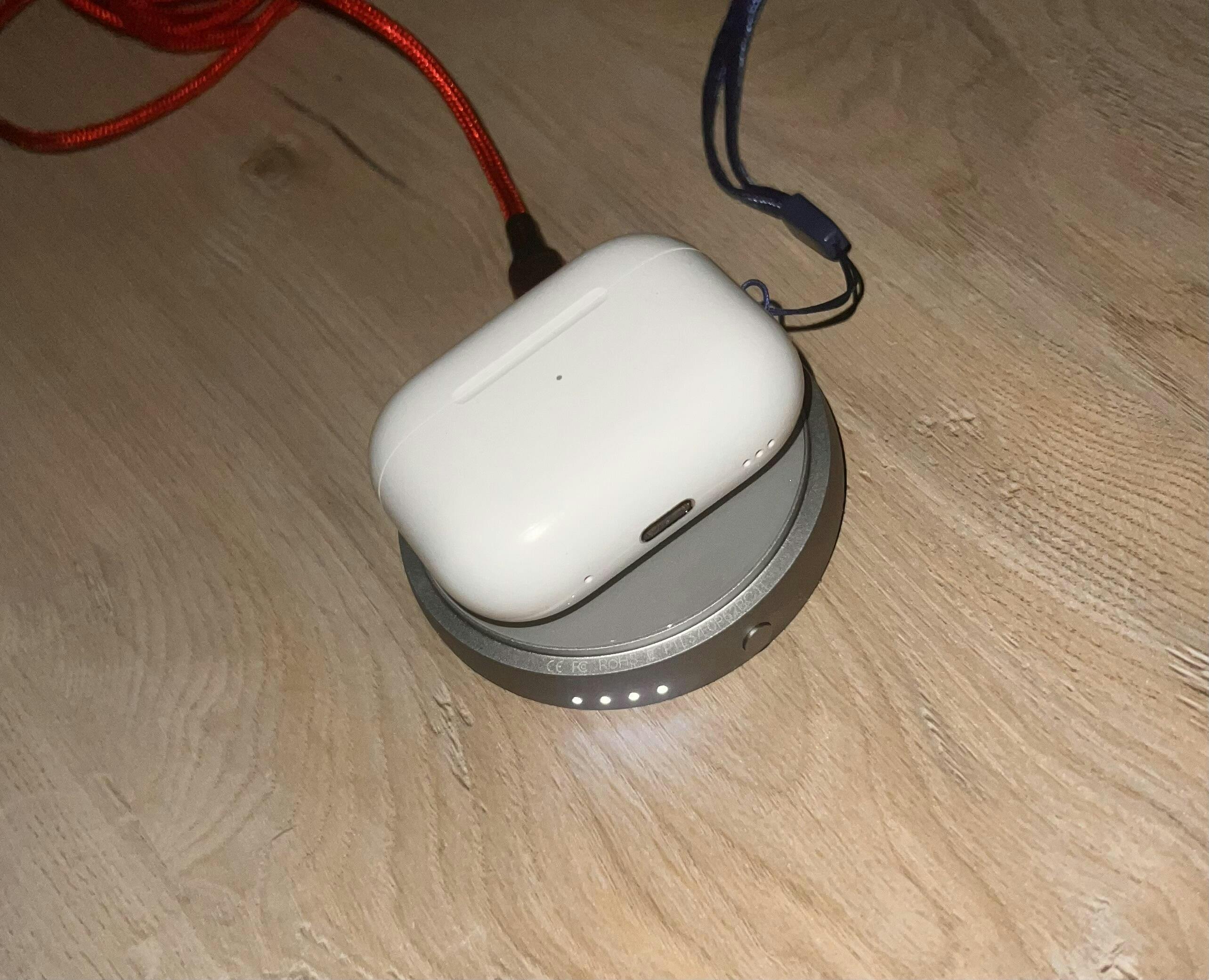 Charges AirPods wirelessly and Apple Watch via USB-C cable.